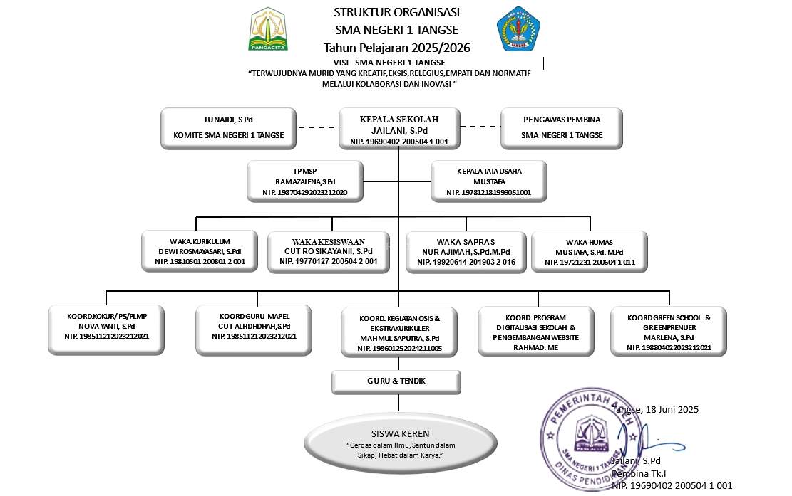 Struktur Organisasi SMA Negeri 1 Tangse disusun sebagai wujud tata kelola sekolah yang sistematis dan profesional, guna menunjang kelancaran proses pendidikan serta pengembangan karakter peserta didik. Struktur ini terdiri dari unsur pimpinan, pelaksana, tenaga pendidik dan kependidikan, serta organisasi kesiswaan yang bekerja secara sinergis dalam mencapai visi dan misi sekolah.